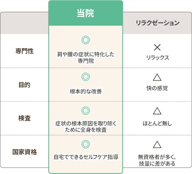 他の整骨院では、表に出ている症状にアプローチし改善を図る「対症療法」が一般的です。